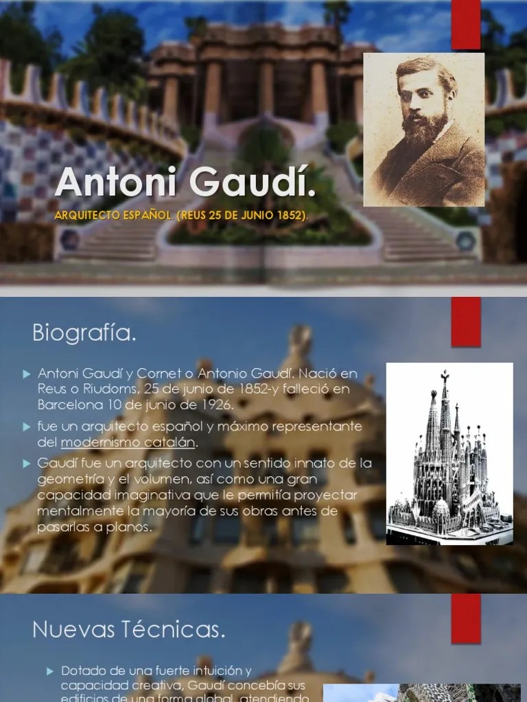 Cada detalle del edificio está perfectamente hecho, y podemos apreciar obras con varios materiales, hierro forjado, madera, vidrieras, azulejos de cerámica, adornos hechos con piedra arenisca, todo creado por artesanos en formas que han trascendido el tiempo... Antonio gaudí es una de las figuras más relevantes y admiradas de la arquitectura española. Cada detalle del edificio está perfectamente hecho, y podemos apreciar obras con varios materiales, hierro forjado, madera, vidrieras, azulejos de cerámica, adornos hechos con piedra arenisca, todo creado por artesanos en formas que han trascendido el tiempo. Parque güell, palacio güell, casa milá, casa vicens, la obra de gaudí en la fachada de la natividad y la cripta de la sagrada familia, la casa batlló y la cripta de la colonia güell.